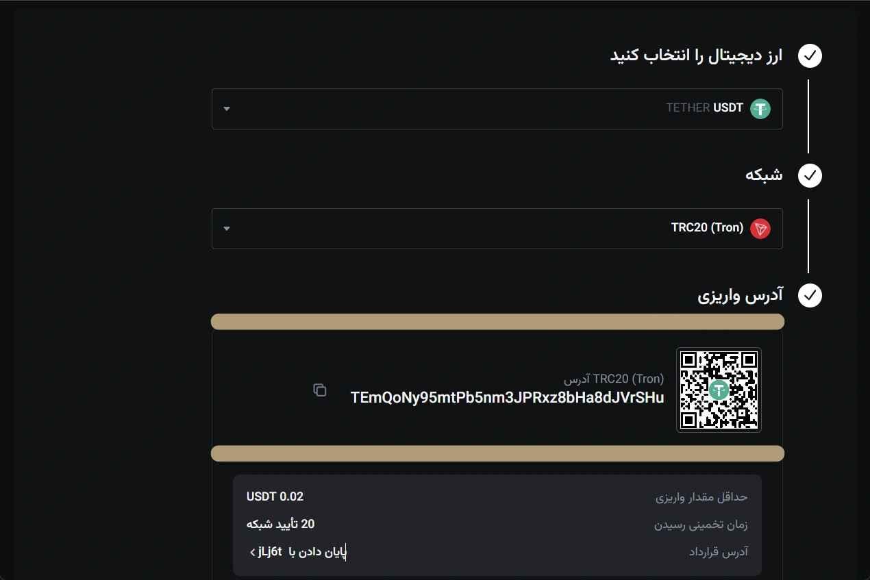 آدرس واریز نمایش داده میشود و میتوانید رمز ارز خود را به آن ارسال کنید.