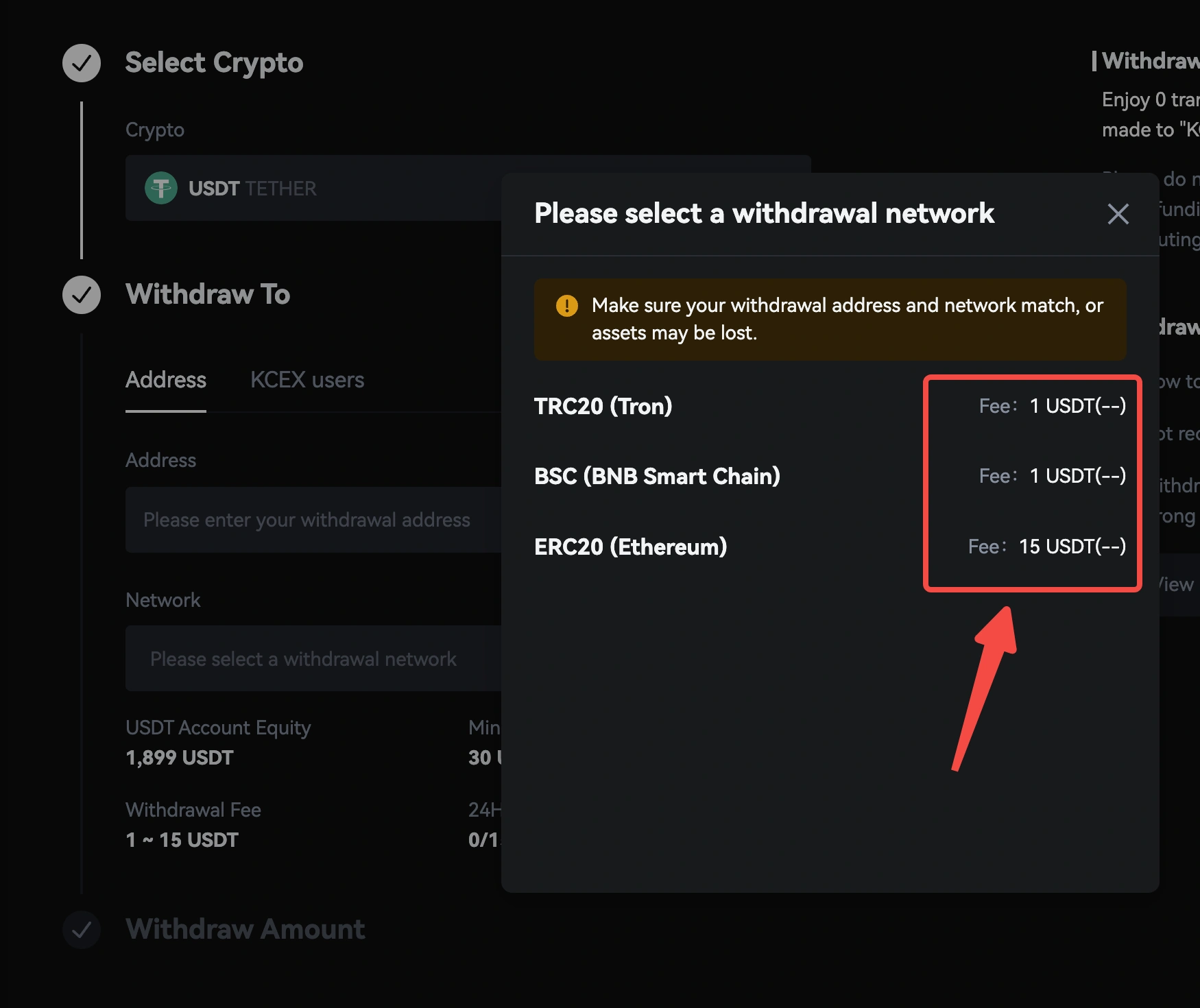 برای مثال، برداشت تتر (USDT) در شبکه اصلی کارمزدی متفاوت با برداشت همان دارایی در شبکههای جانبی دارد. برداشت روی شبکه ERC20 معمولا هزینه بیشتری نسبت به TRC20 یا BEP20 دارد.