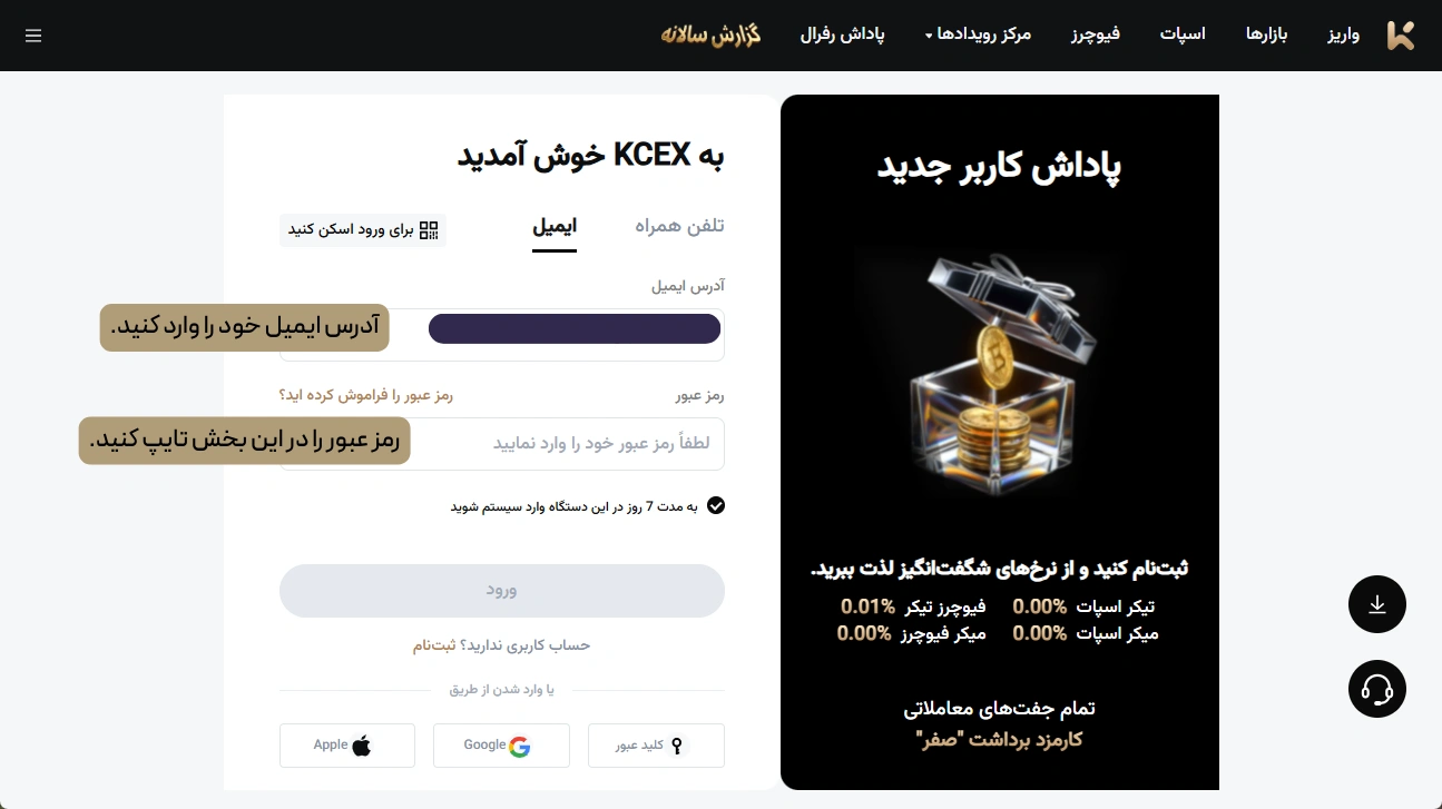 ابتدا وارد وب سایت صرافی KCEX شوید سپس با نام کاربری و رمز عبور خود پنل شخصی خود را باز کنید.